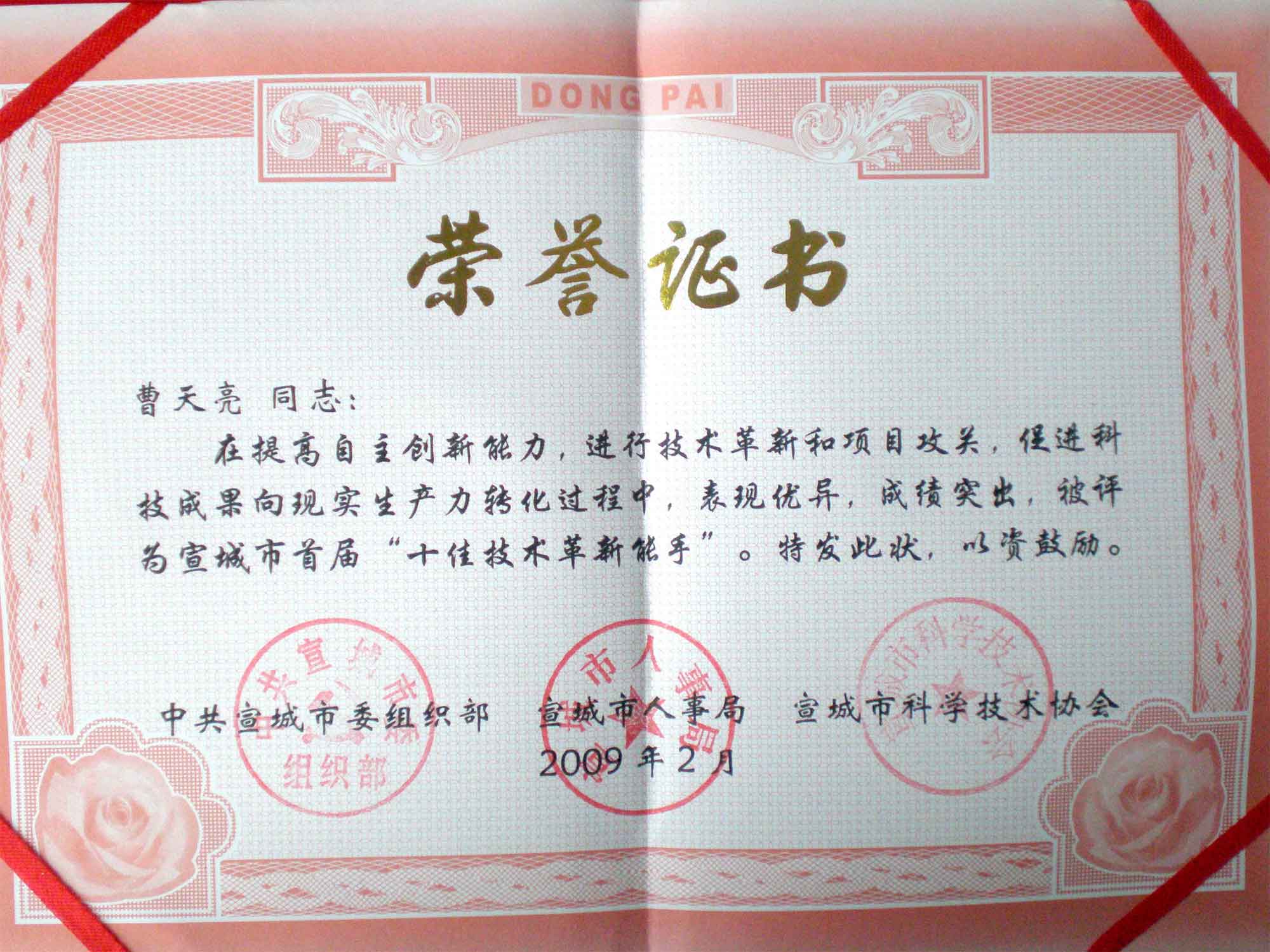 曹天亮同志在担任公司副总经理期间,在提高自主创新能力,进行技术革新和项目攻关,促进科技成果向现实生产力转化过程中,成绩突出。被评为宣城市首届“十佳技术革新能手”。