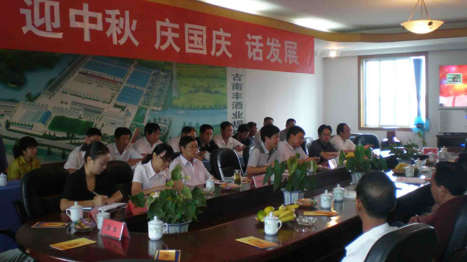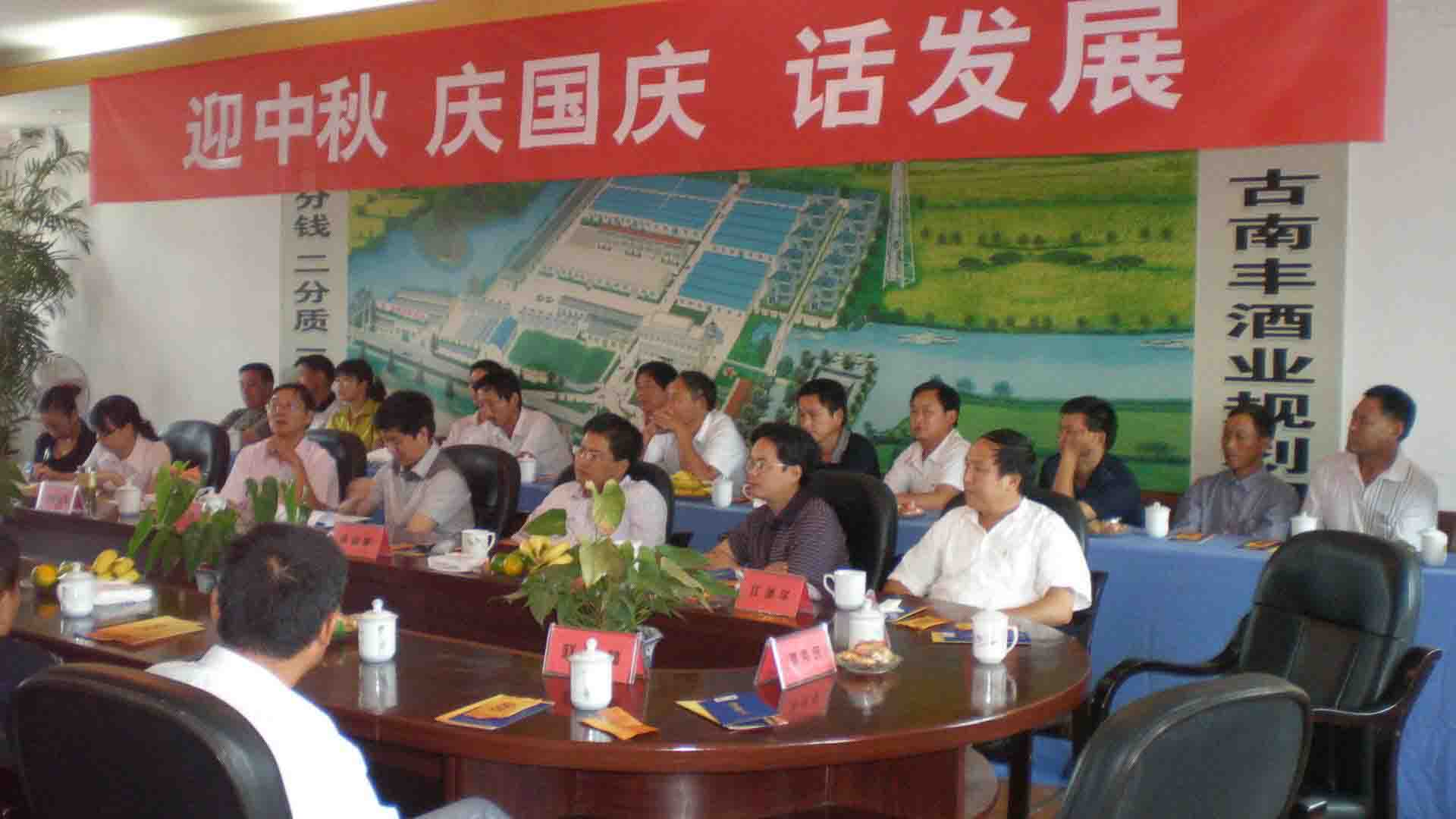 安徽省古南丰酒业有限公司在2009年9月9日上午8:30分在公司会议室举办了迎中秋,庆国庆,谋发展座谈会,参加这次座谈会的有郎溪县农发局、南丰镇党委、人大、政府班子。南丰镇各行政村主要负责人,土地流转核心区两个行政村的两委干部,涉及到土地流转、土地治理的各村民组组长和代表,绿色糯稻种植各作业区负责人,绿色糯稻种植技术员等近60人。