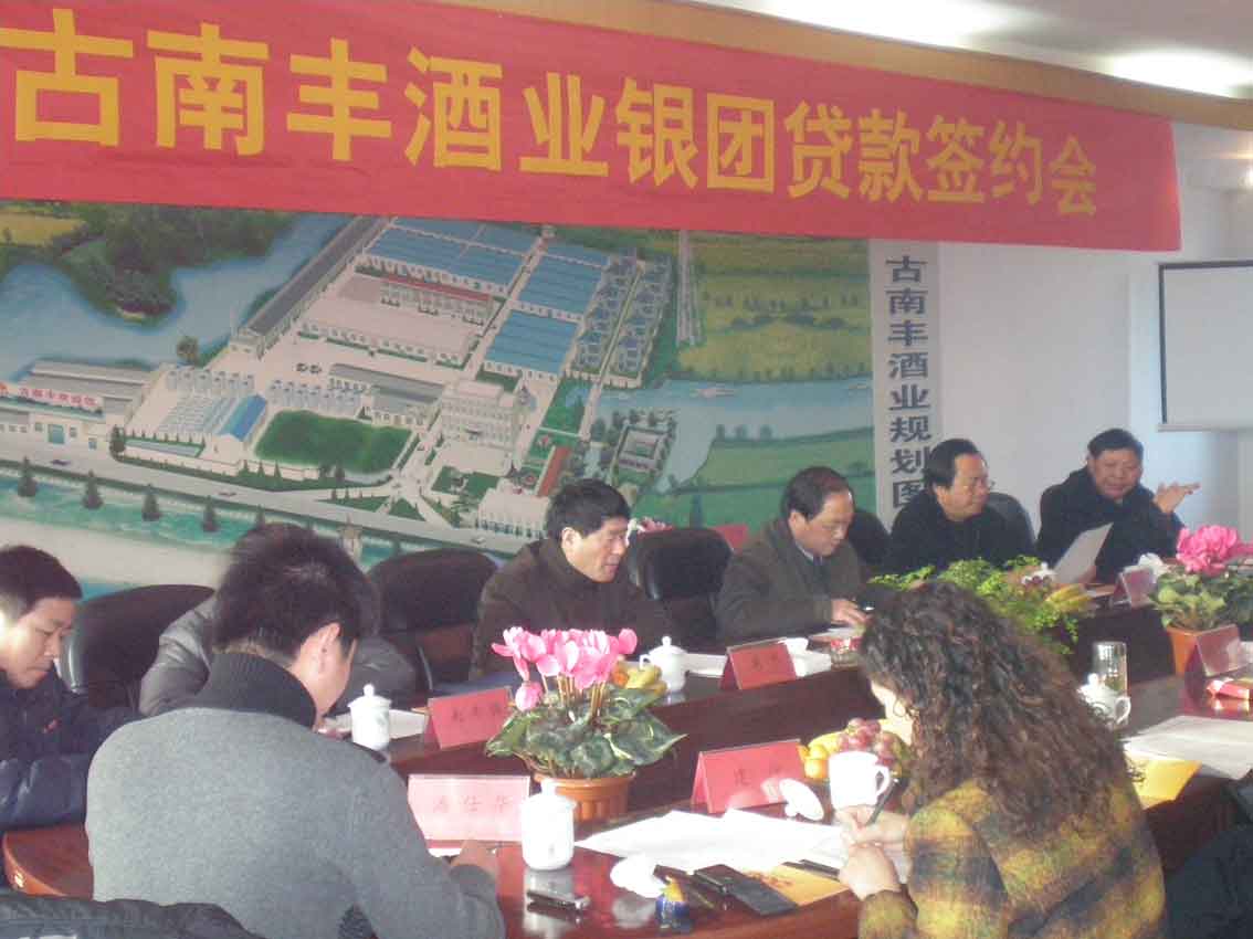 12月16日.在公司二楼会议室举行了“古南丰酒业银团贷款签约仪式”.会议首先由古南丰酒业总经理潘仕华对县委、县政府,县各金融部门对我们企业的关心和厚爱表示感谢,并对公司2009年的生产经营情况及下一步发展思路做了汇报,表示有信心、有决心在国家优惠政策的帮扶下,在各级相关部门的关心和支持下,抢抓住发展的机遇,迎难而上,为古南丰的二次飞跃,寻求新的发展机遇,树立远大的目标而不懈努力。
