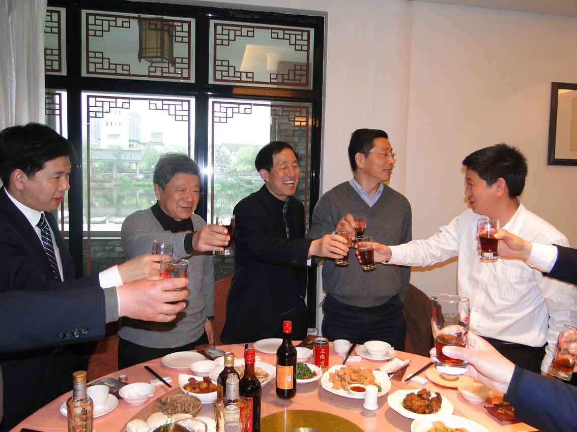 2010年4月7日星期三参观团队在胡秘书长的支持和陪同下继续绍兴学习之旅。上午大家来到了位于滨海工业区的梁祝酒业。得到了公司首席酿造大师郑家华、总工程师丛敏的接待,并陪同参观了公司的无菌生产车间和工艺流程。公司生产环境的管理得到参观人员的一致欣赏。下午大家一同来到了古越龙山第三分厂参观,规模、流畅的黄酒生产给大家留下了深刻的印象。随后傍晚时分大家来到了中国黄酒博物馆,一同学习黄酒发展历史和文化,并有幸与黄酒协会沈秘书长等几位黄酒界前辈、领导一同共进晚餐,品尝黄酒佳宴。