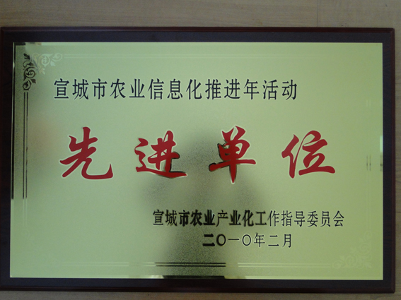 2009年我公司在实施农业信息化推进年活动中,按照市委、市 政府的要求,高度重视,扎实工作,取得了良好的成效,被市政府评为2009年度农业信息化推进年活动先进单位。