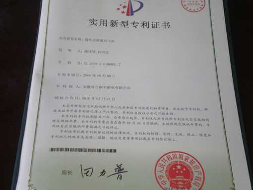 2010年7月我公司研发的循环式淋瓶风干机喜获国家实用新型专利,这是我司酒瓶灌装过程中技术设备上的一大进步。这种实用新型的淋瓶、吹瓶设备集于一体,淋洗、风干瓶身一次性完成,既节约生产时间,减少设备占用面积,又能降低能耗,提高生产效率。