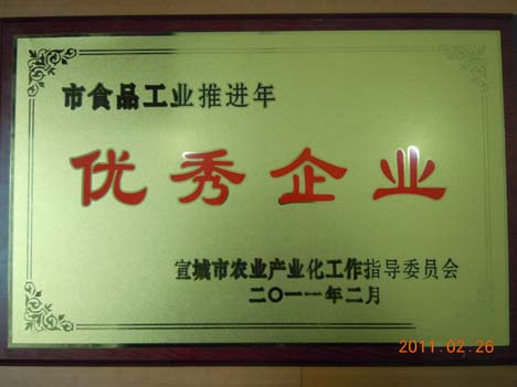 2010年,我公司等10家农业产业化龙头企业在宣城市食品工业推进年活动中被授予“优秀企业”称号。