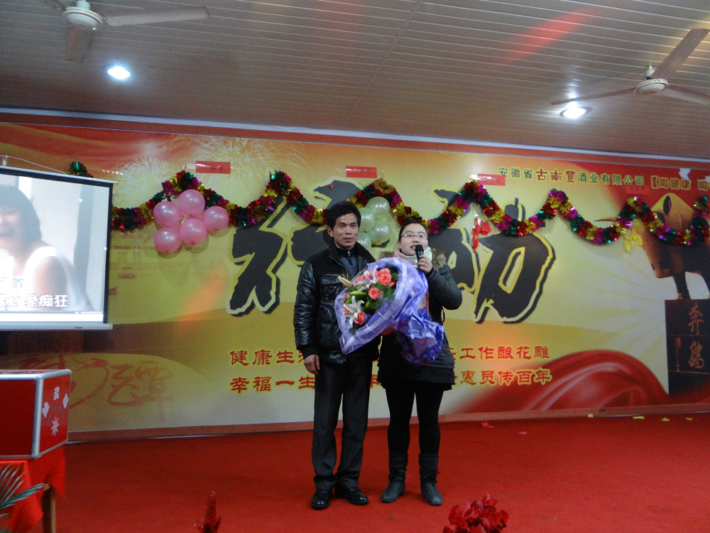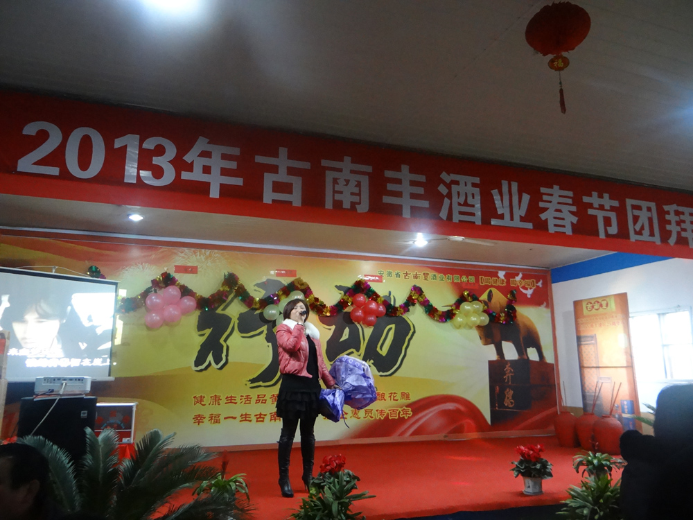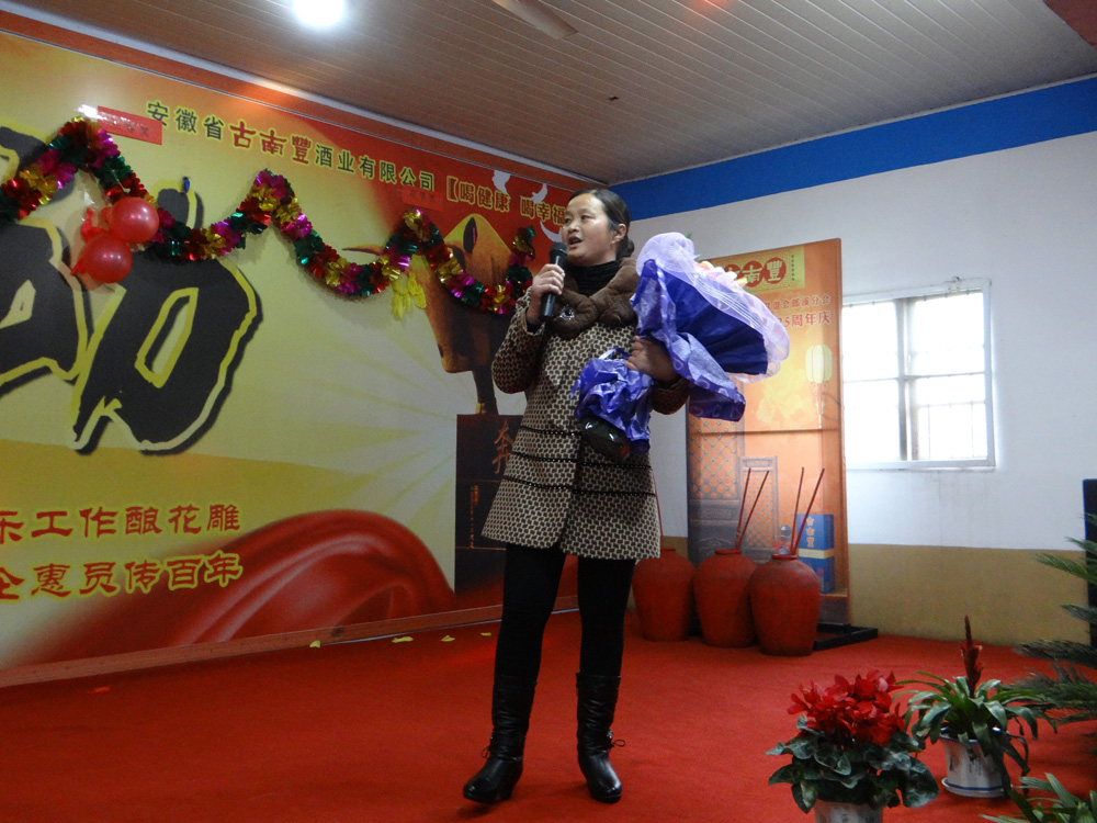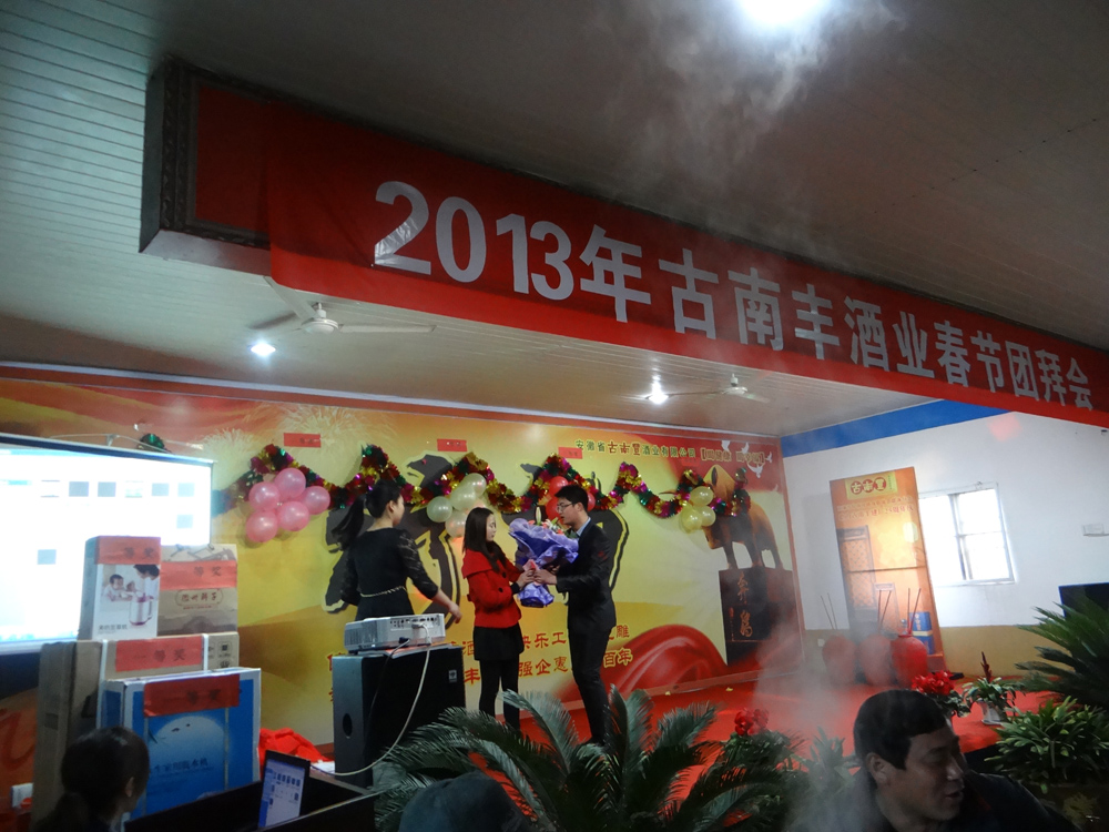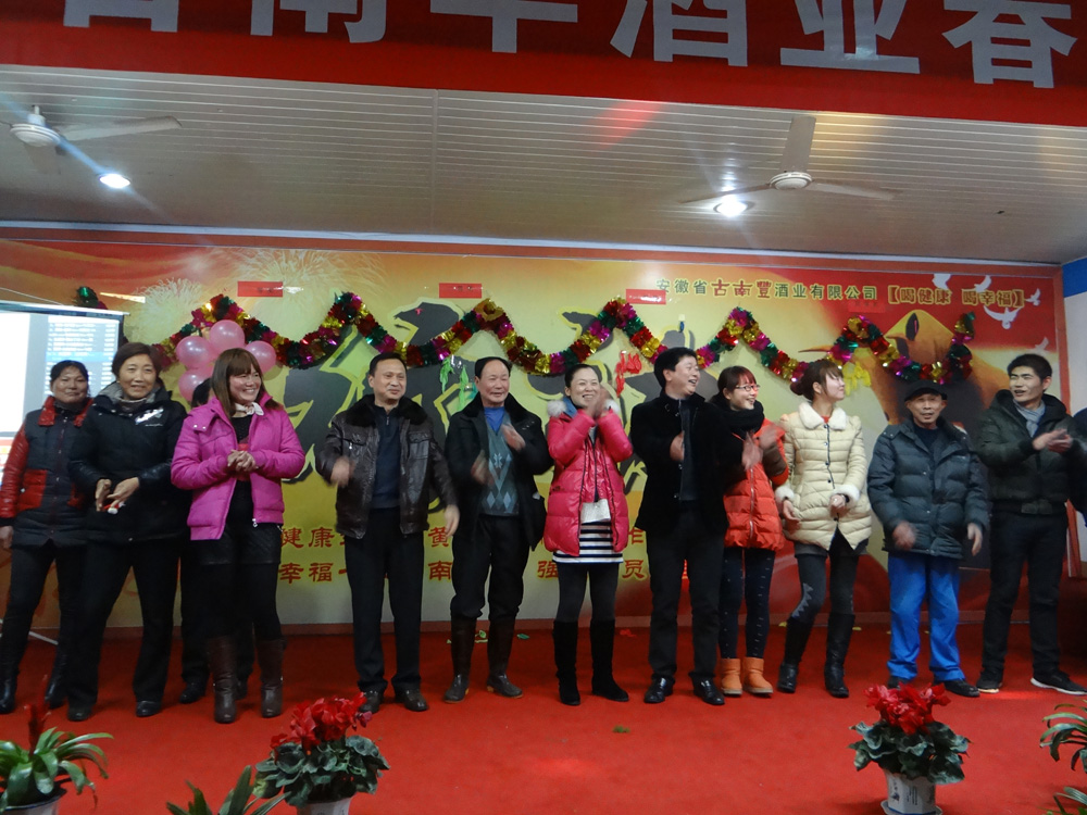 宴会开始前,董事长潘跃国致热情洋溢的祝酒辞,场面热闹非凡,大家举杯同庆,共迎美好新年。在精彩的文艺表演阶段,各个部门积极参与、各显专长,体现了公司的人才济济。文艺演出现场穿插了激动人心的抽奖环节,参与演出的员工现场抽取幸运者,20多份礼品等待归属,制造了一轮轮狂欢的高潮。演出最后在汪庆武倾情演唱的《古南丰之歌》中落幕,值得一提的是汪师傅出于对公司的热爱之情,自己为公司谱写了一首《徽派第一窖》并现场演唱,引起场下一阵阵掌声与欢呼。