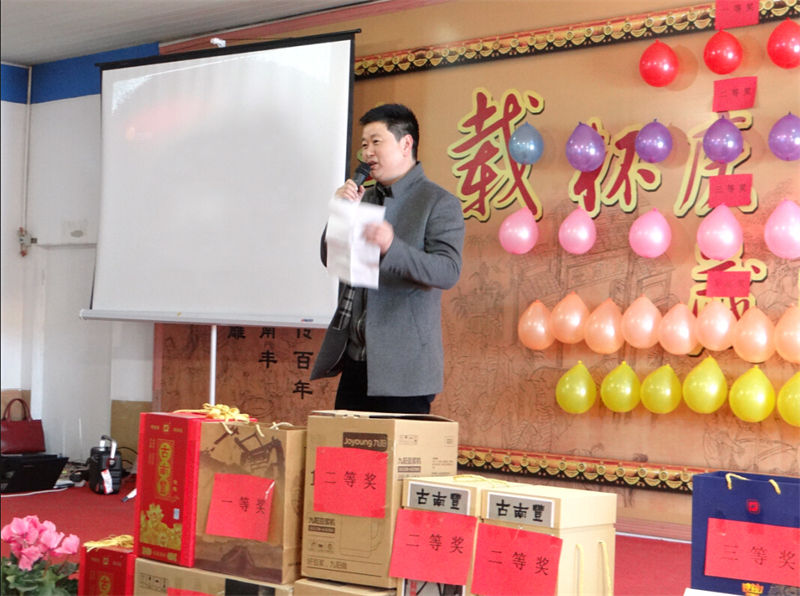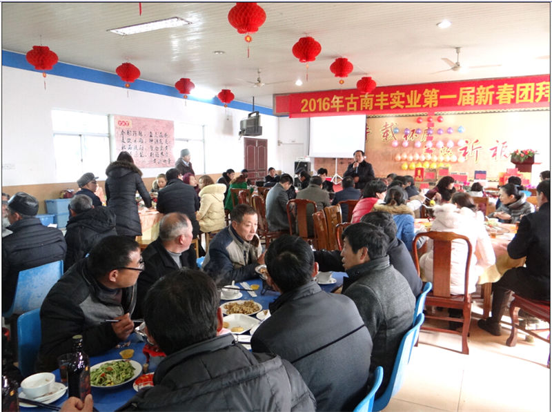 在百斤推饭甑全场跑体力王比赛中,花甲之年的酿造技师豪气不减,争先破关闯进赛点一决高下。此时瓶装线装上的女工也在紧张进行着包装能手比赛,三人一组,快手如云。员工技能比拼刚刚结束,鼓声雷动,炮声齐鸣,两条金龙在行政楼前舞动起来。龙灯接来探酒香,祈福一年风调雨顺、五谷丰登。场外热闹,场内氛围不减。公司董事长、总经理对古南丰人猴精、猴蹦、猴美三个猴年特色祝福后,团拜午宴正式开始,也将古南丰实业第一届新春团拜会推向顶点圆满举行。