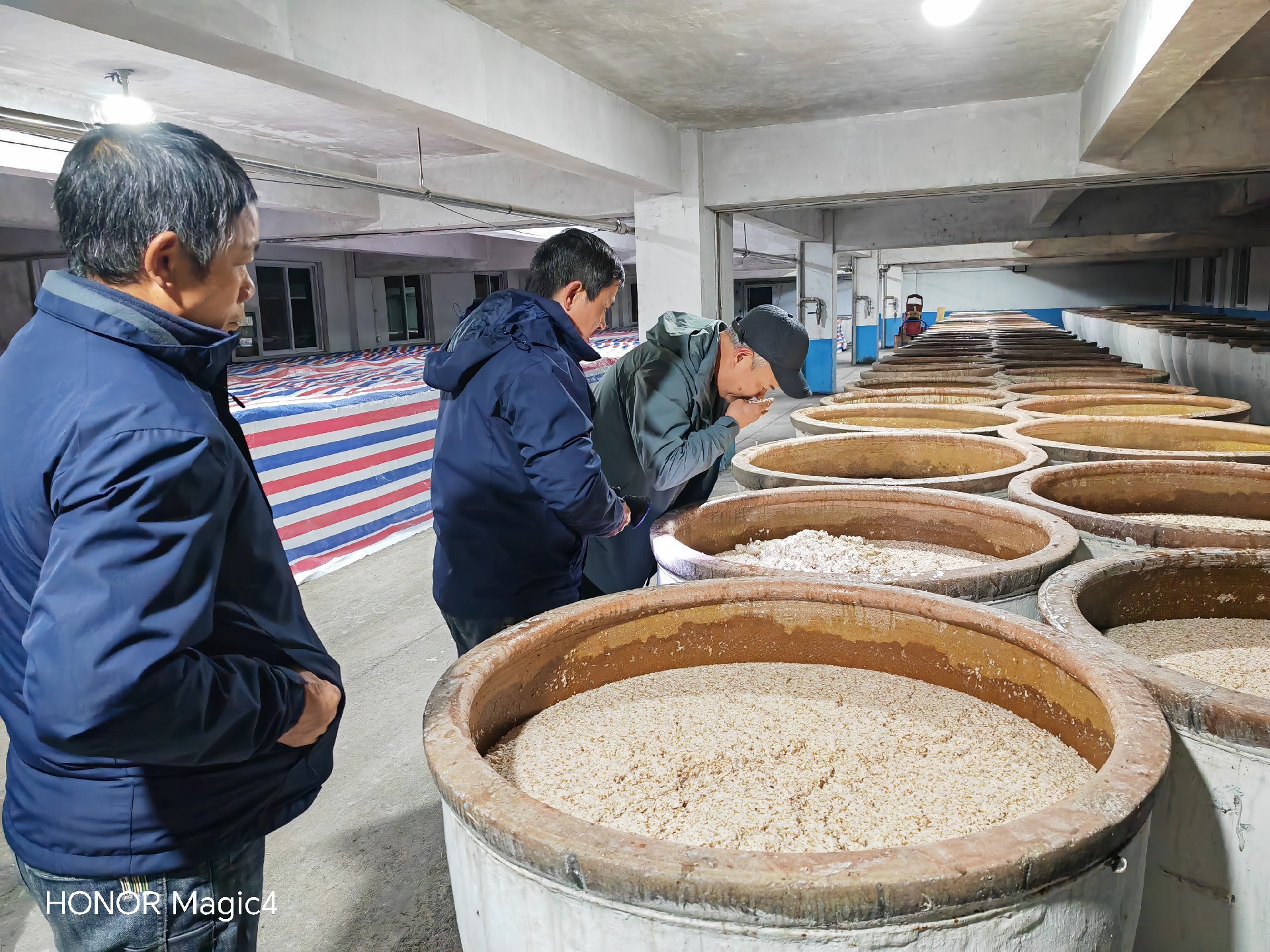 在公司总经理潘仕华的陪同下,潘兴祥大师先走进发酵车间,深入现场与酿酒师交流探讨,通过详细了解传统摊饭生产流程,对公司的生产工艺和质量控制给予了高度评价,并提出宝贵意见和建议,受益匪浅。